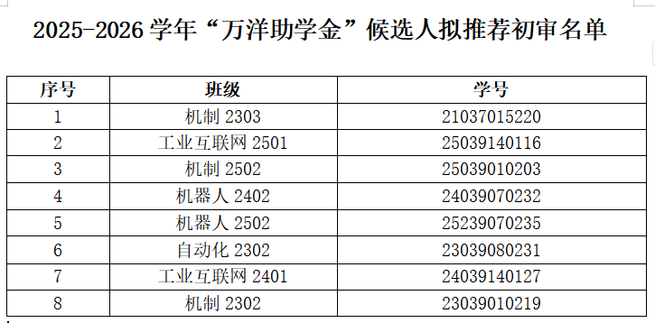 根据《关于开展“万洋助学金”评选工作的通知》文件要求,通过学生申请、学院评审,智能制造学院2025-2026学年“万洋助学金”候选人初审名单已经初步确定。本着公开、公平、公正的原则,现将智能制造学院2025-2026学年“万洋助学金”候选人拟推荐初审名单在全院公示。