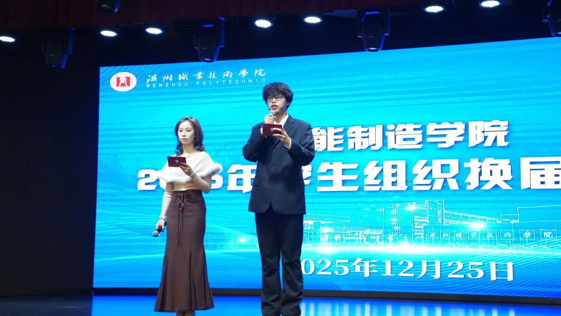 灯光璀璨,掌声雷动,一场关于传承与担当的青春盛会正式落幕!12月25日晚,智能制造学院在高远堂隆重举行2025年学生组织换届大会,智能制造学院学院党总支副书记叶丰、学工办全体辅导员及全体学生干部齐聚一堂,共同见证责任的交接,共赴未来的新征程。